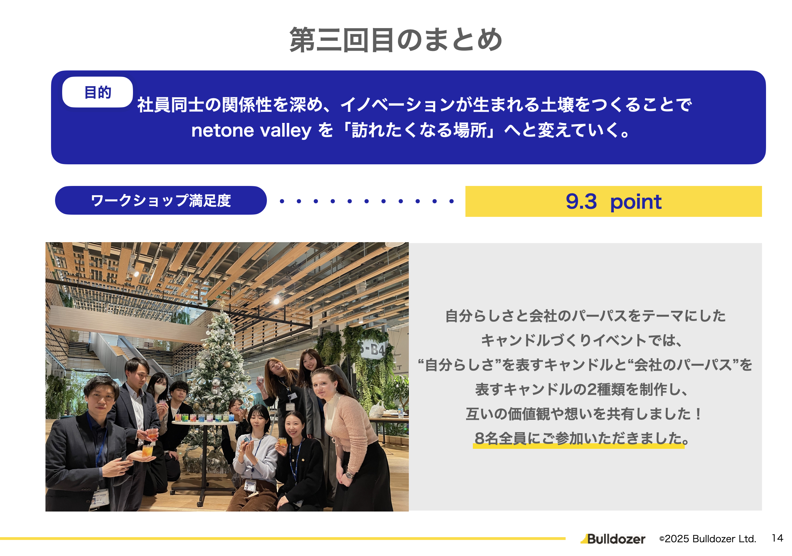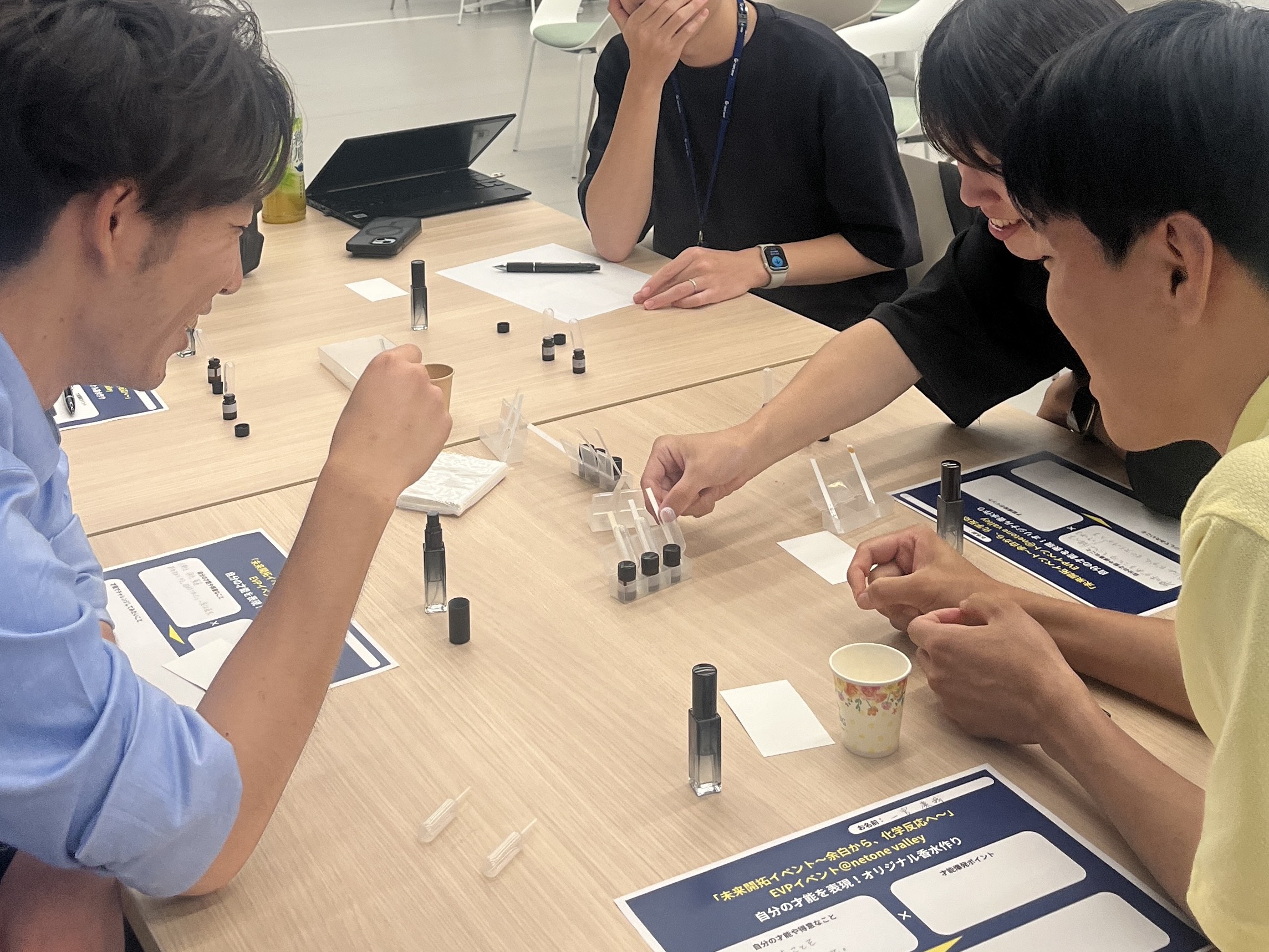 「楽しさ」と「対話」を組み合わせたアプローチにより、社員がnetone valleyをより身近に感じ、今後のコラボレーションや共創につながる基盤づくりを行いました。香水作り・時間術・キャンドル作りといった 業務から離れた「体験型・創作要素の有り」のワークショップ を実施し、社員が自分自身の価値観や強みを改めて捉え直す機会を創出しました。