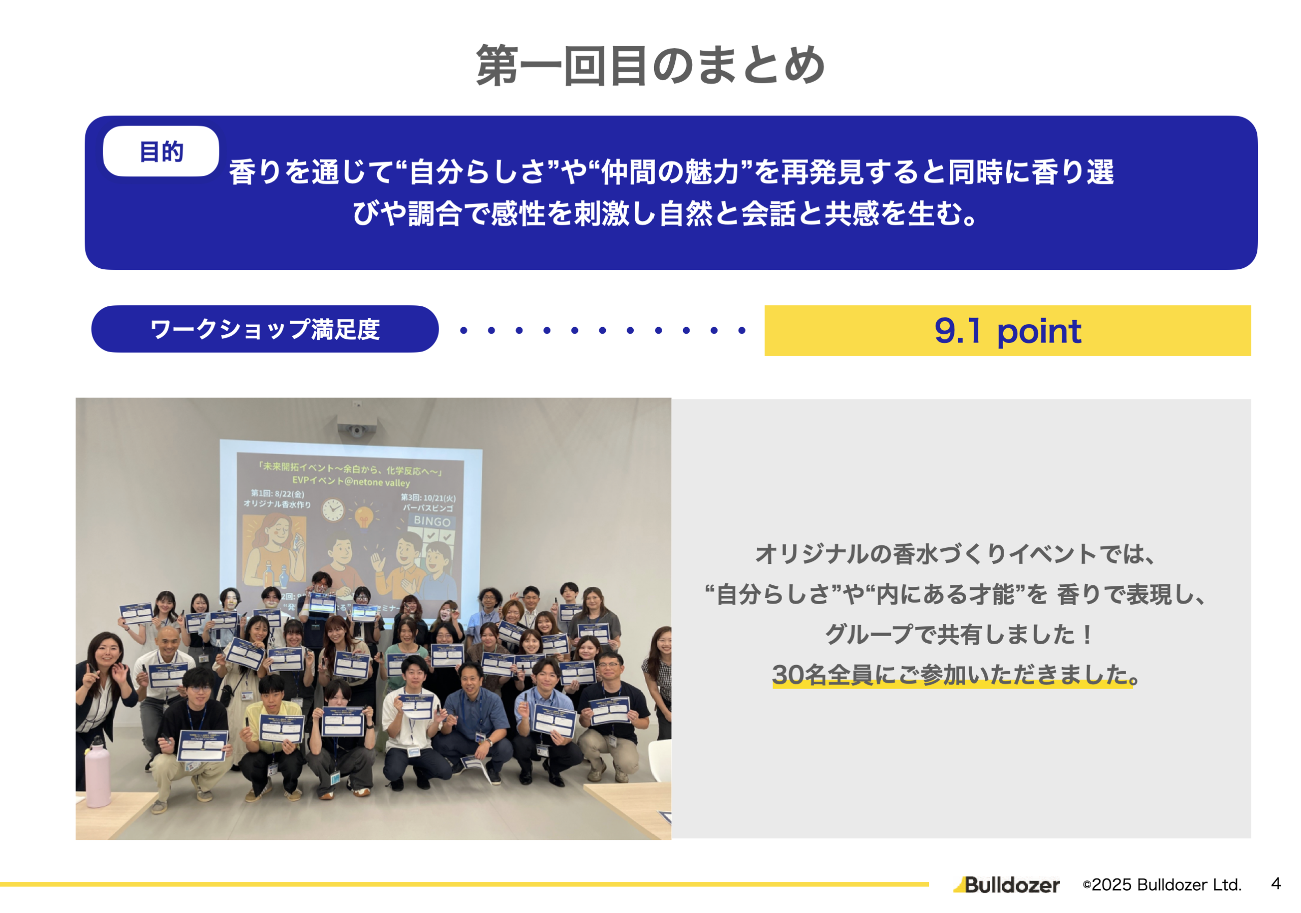 香水作り・時間術・キャンドル作りといった、興味を引くテーマを入口に、参加者が自身の関心に合わせて参加できる形としました。一見すると「楽しそうな取り組み」に見えるかもしれませんが、任意参加で社員を無理なく巻き込み、組織文化を育てていくうえで、こうした“遊び心”のあるアプローチは大きな意味を持っています。 ここでの「遊び」は単なる娯楽ではなく、自分の考えや想いを言語化し、自己表現として他者と共有するプロセスも含めて設計しています。