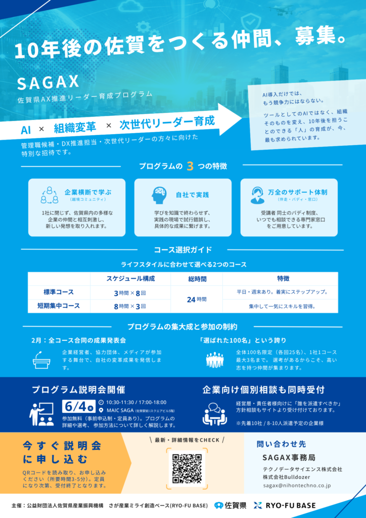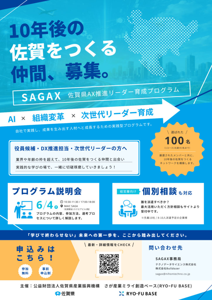 株式会社Bulldozerは、テクノデータサイエンス株式会社、日本テクノシステム株式会社、株式会社Bulldozerによる共同企業体(佐賀AXリーダー創発コンソーシアム)の一員として、RYO-FU BASE(さが産業ミライ創造ベース)が実施する令和8年度「AX推進人材育成・確保事業」において、委託事業者に選定されました。